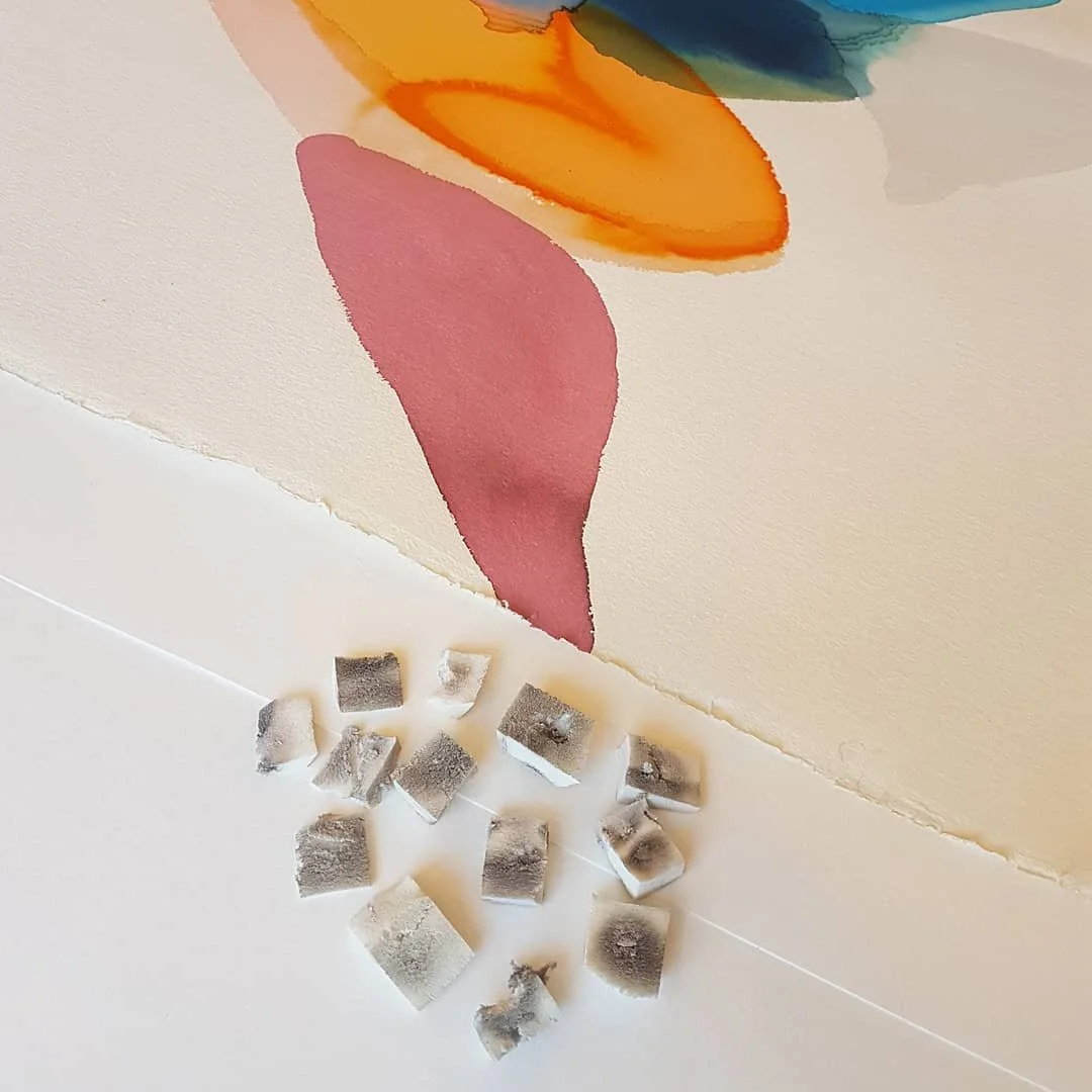 “Up to 40 years of surface dirt removed from this 1979 Alice Baber watercolour. Poor previous repairs were also addressed and replaced using conservation grade methods- safer for the artwork and less distracting visually. Very satisfying to see the dirt removed!”